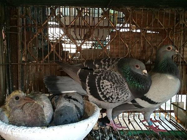 上圖灰母鴿就是他的外孫女,斑公鴿則是一羽超級金母直孫,目前正育雛中,是2015年北海春季比賽的配對.